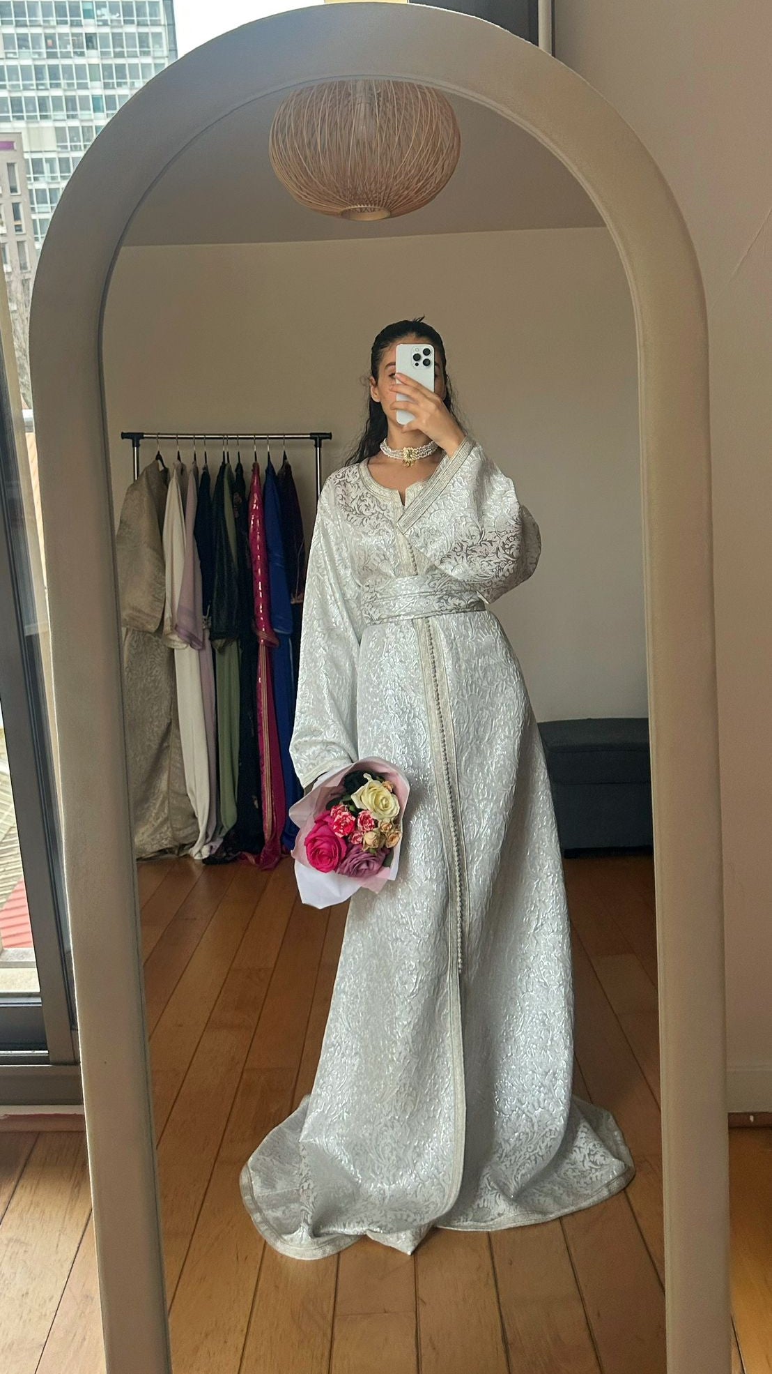 Pensé pour le grand jour, ce caftan allie noblesse des matières, sobriété des finitions et tradition marocaine, pour une silhouette à la fois majestueuse et pleine de douceur.