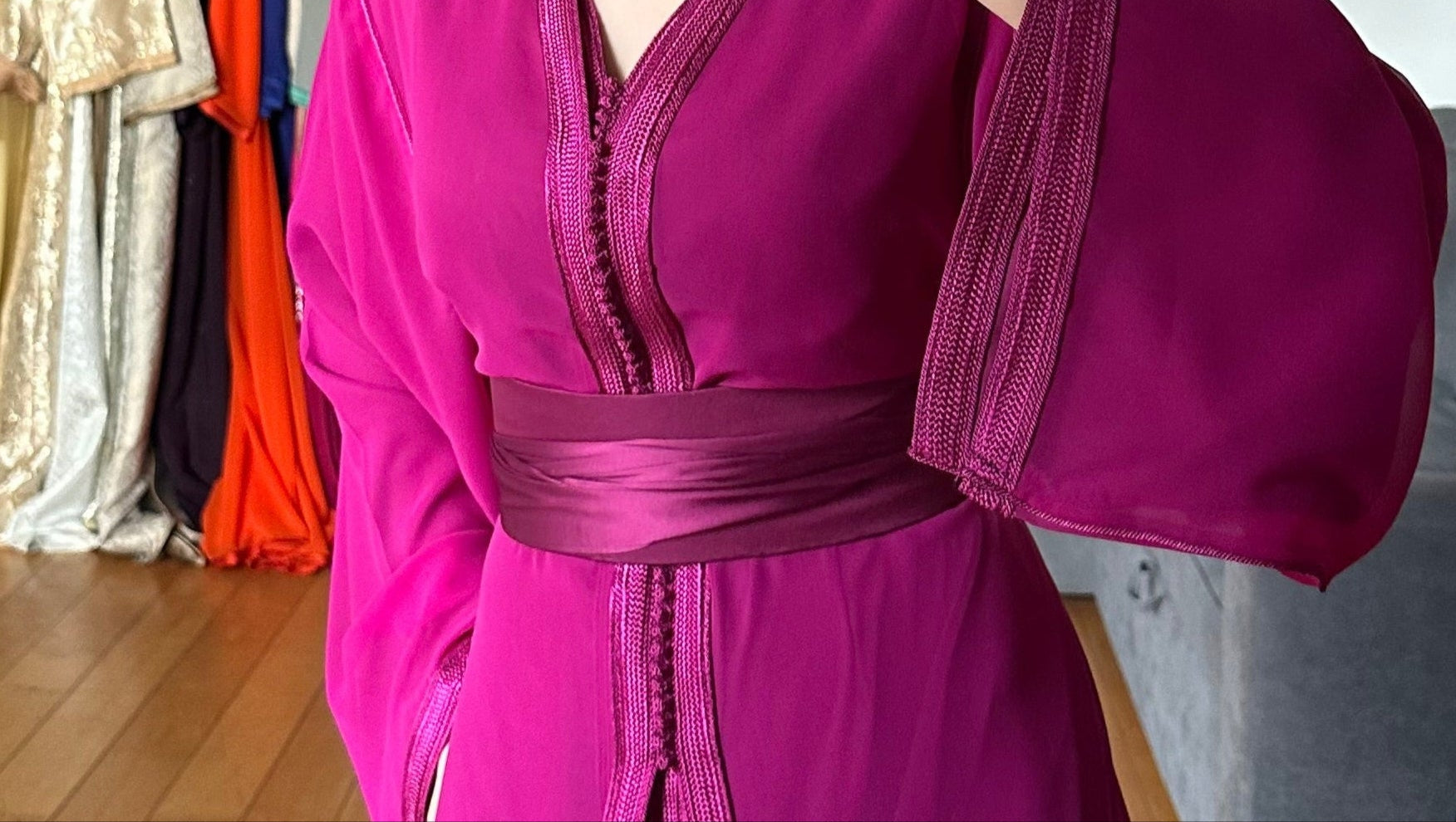The silk inner caftan, in a deep purple hue, creates a luxurious and comfortable base. The delicately layered chiffon overdress enhances the ensemble with its light veil. The interplay of the two materials gives the piece an elegant volume and graceful movement that will captivate all eyes.