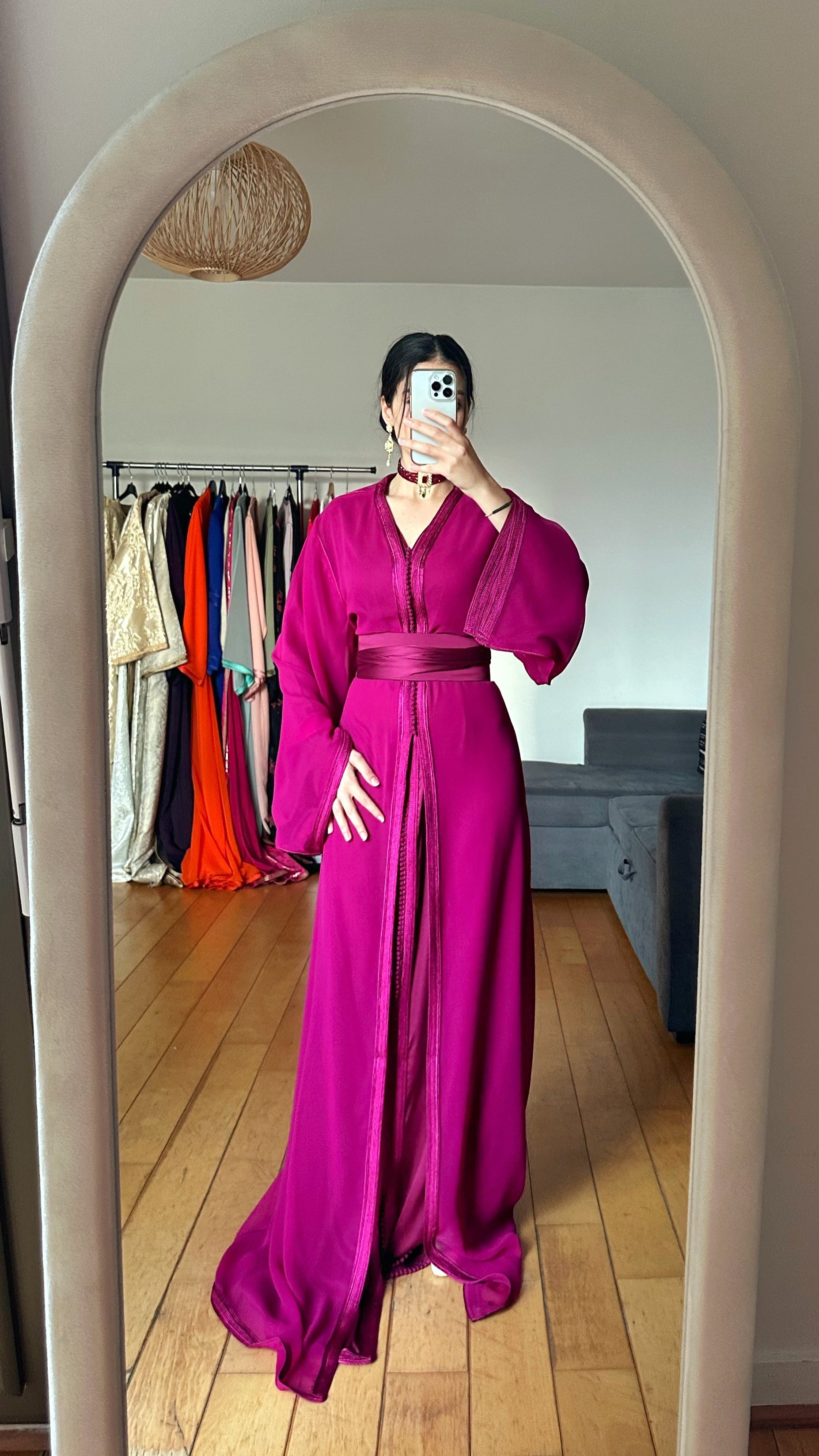 Discover unparalleled elegance with this deep purple caftan, a creation designed for those who seek the exceptional. Its two-piece structure harmoniously combines the richness of silk and the airy fluidity of chiffon .