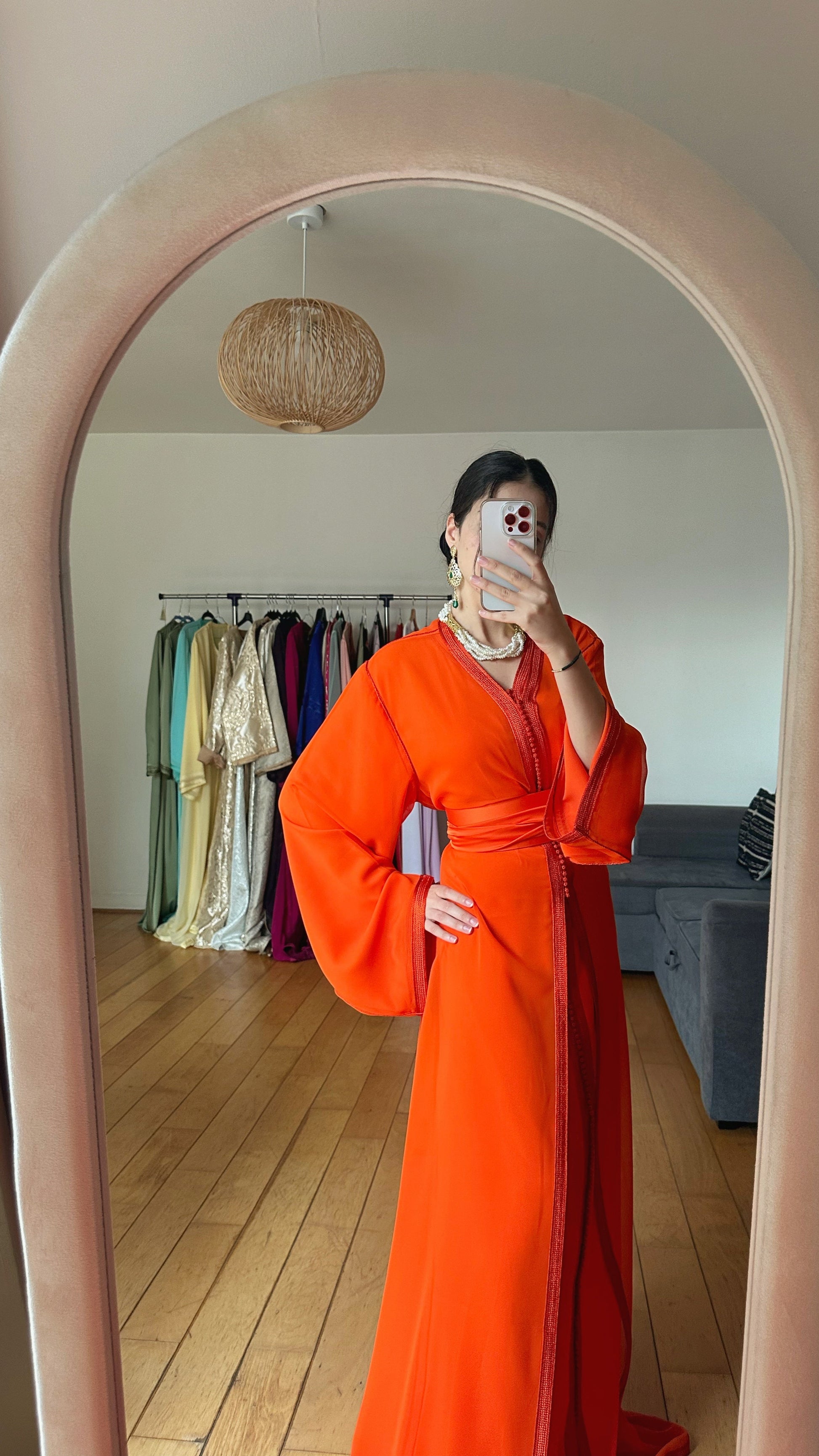 Brighten up your events with this magnificent orange caftan, a statement piece that blends tradition and modernity. Designed in two pieces for a fluid and refined silhouette, this set consists of a luxurious silk inner caftan and a light, airy chiffon overdress.