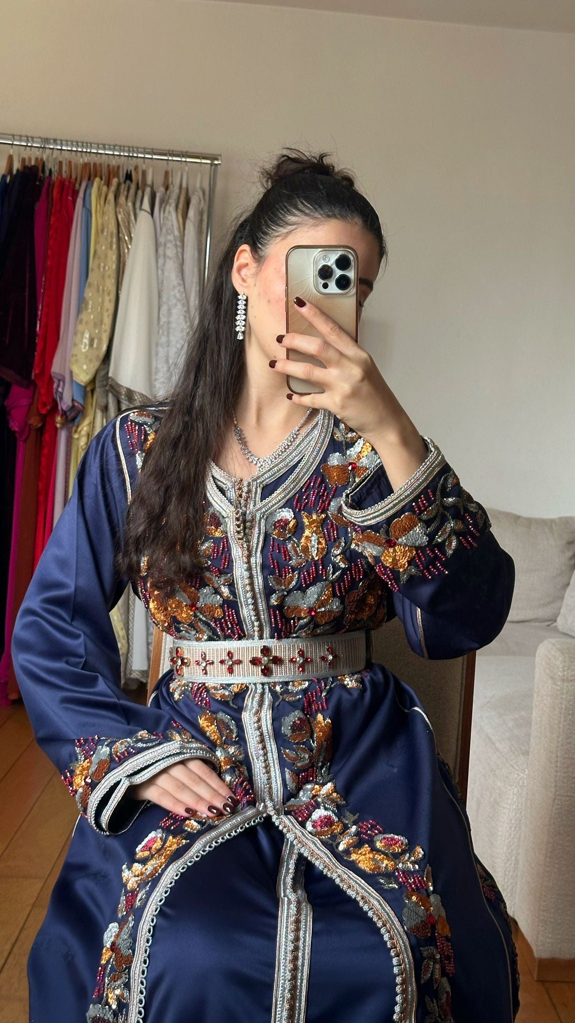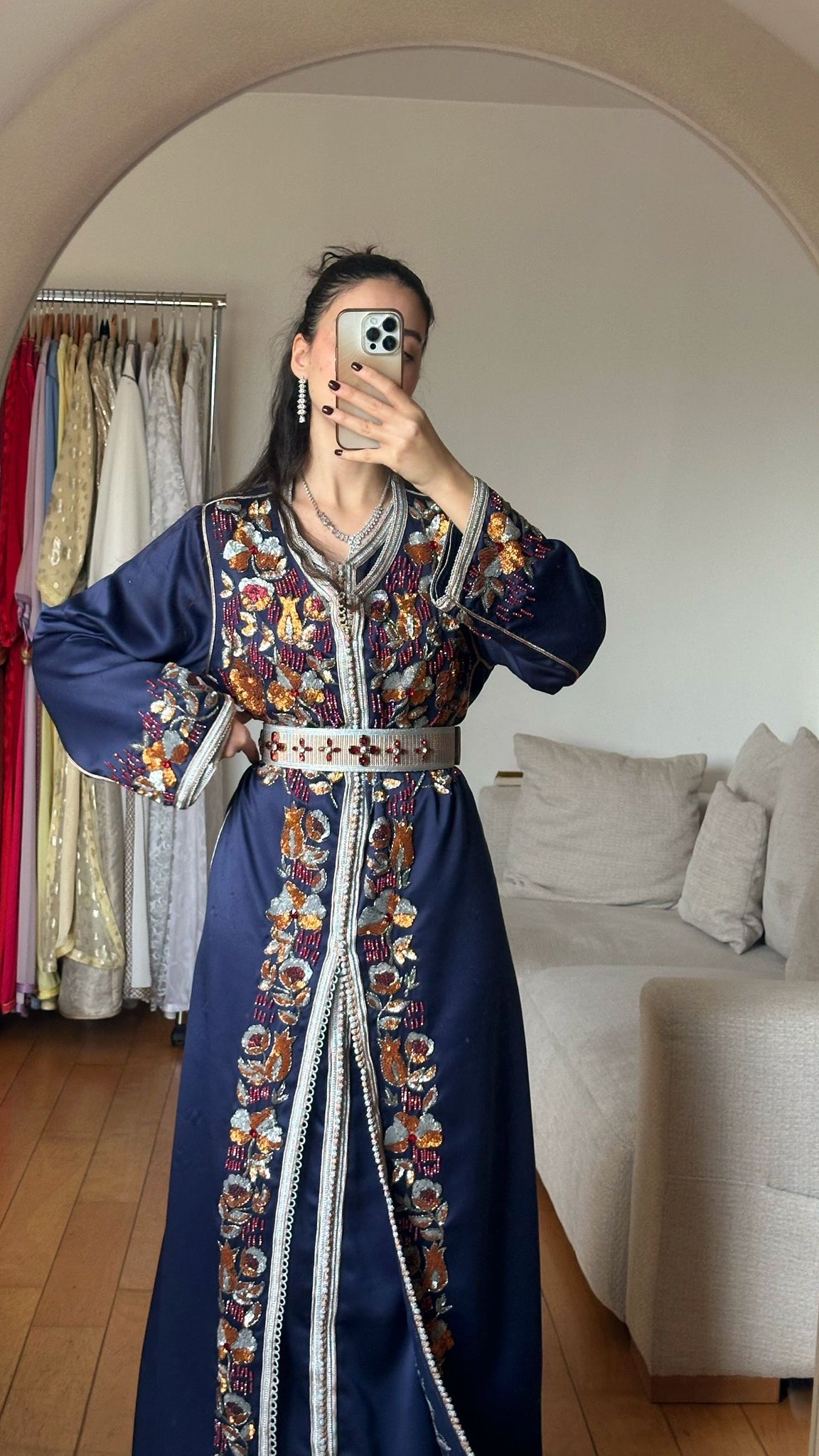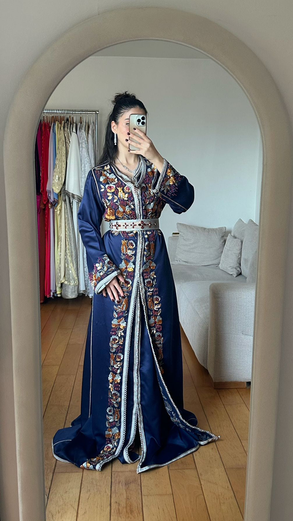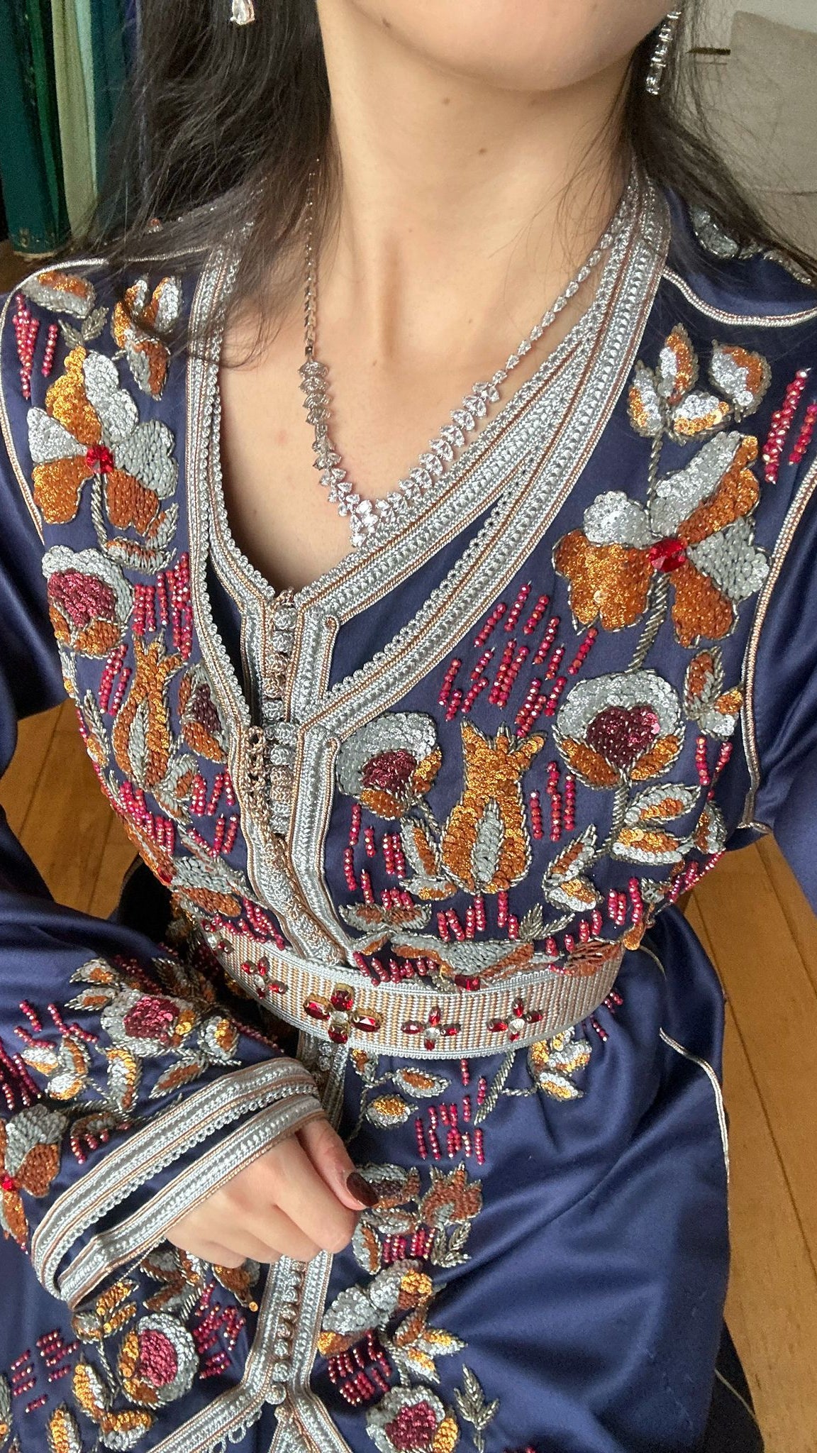 Le col et le devant sont sublimés par une sfifa argentée finement réalisée, tandis que la ceinture assortie, également travaillée avec soin, structure la taille avec élégance et s’adapte harmonieusement à toutes les morphologies.