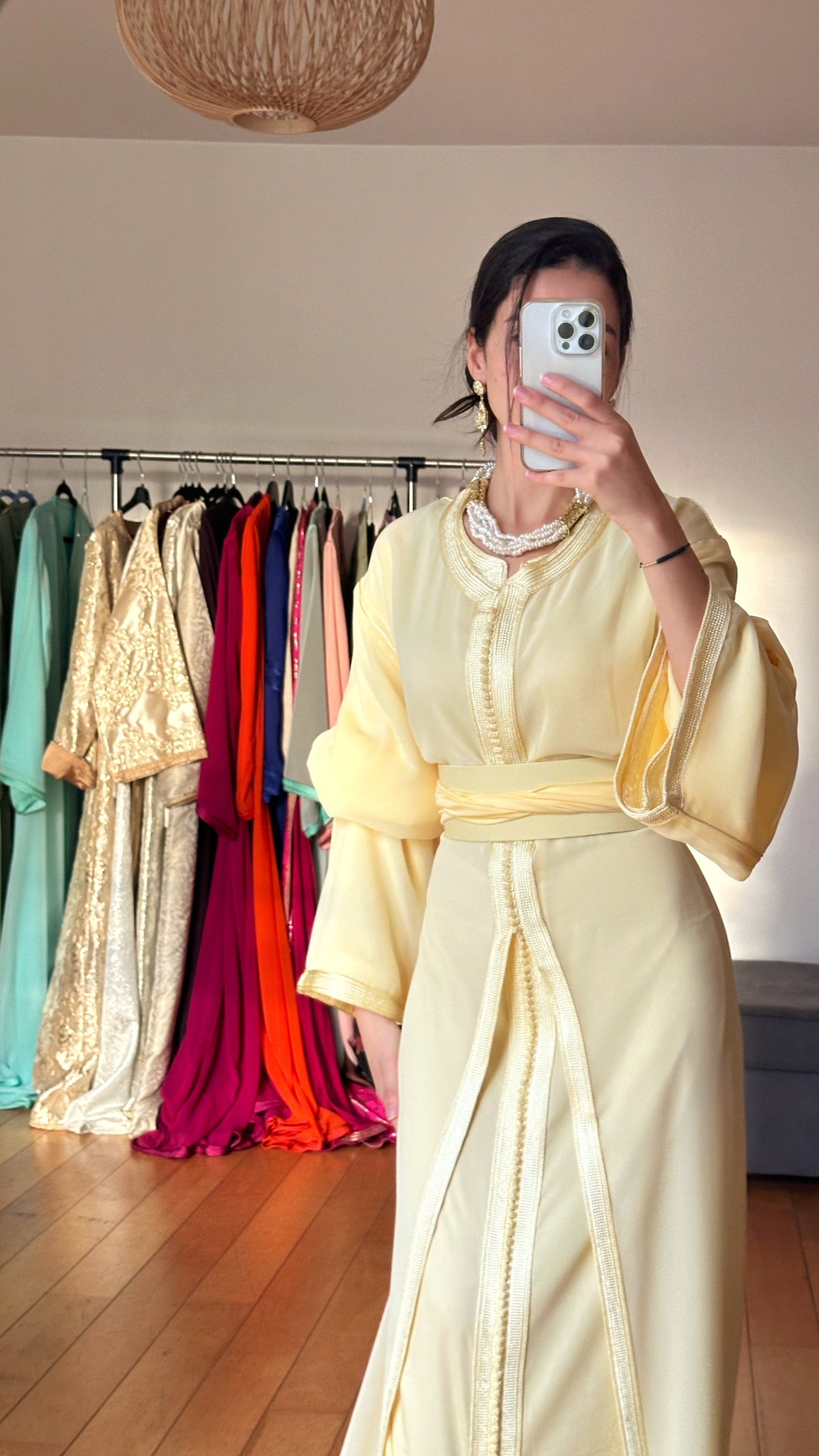 Confortable et raffiné, ce caftan allie la légèreté de la mousseline à la douceur luxueuse de la soie, pour un tombé parfait et une allure distinguée.