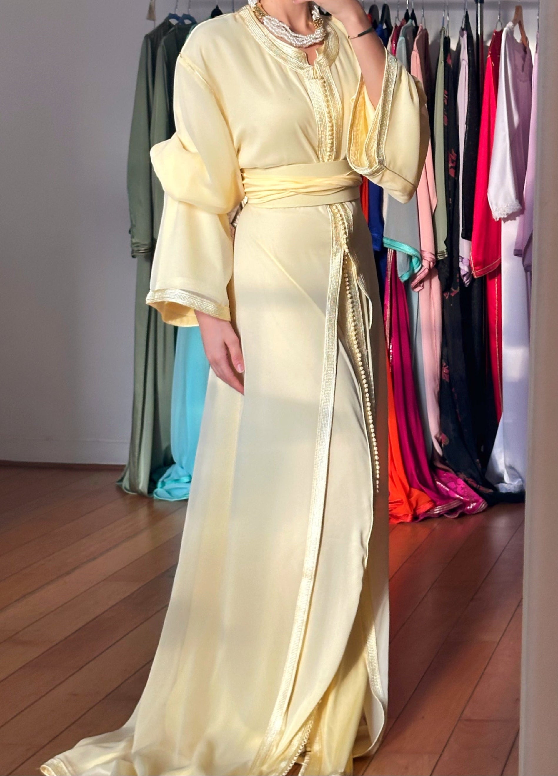 • Matière : 100% Soie (caftan intérieur), Mousseline (sur-robe)