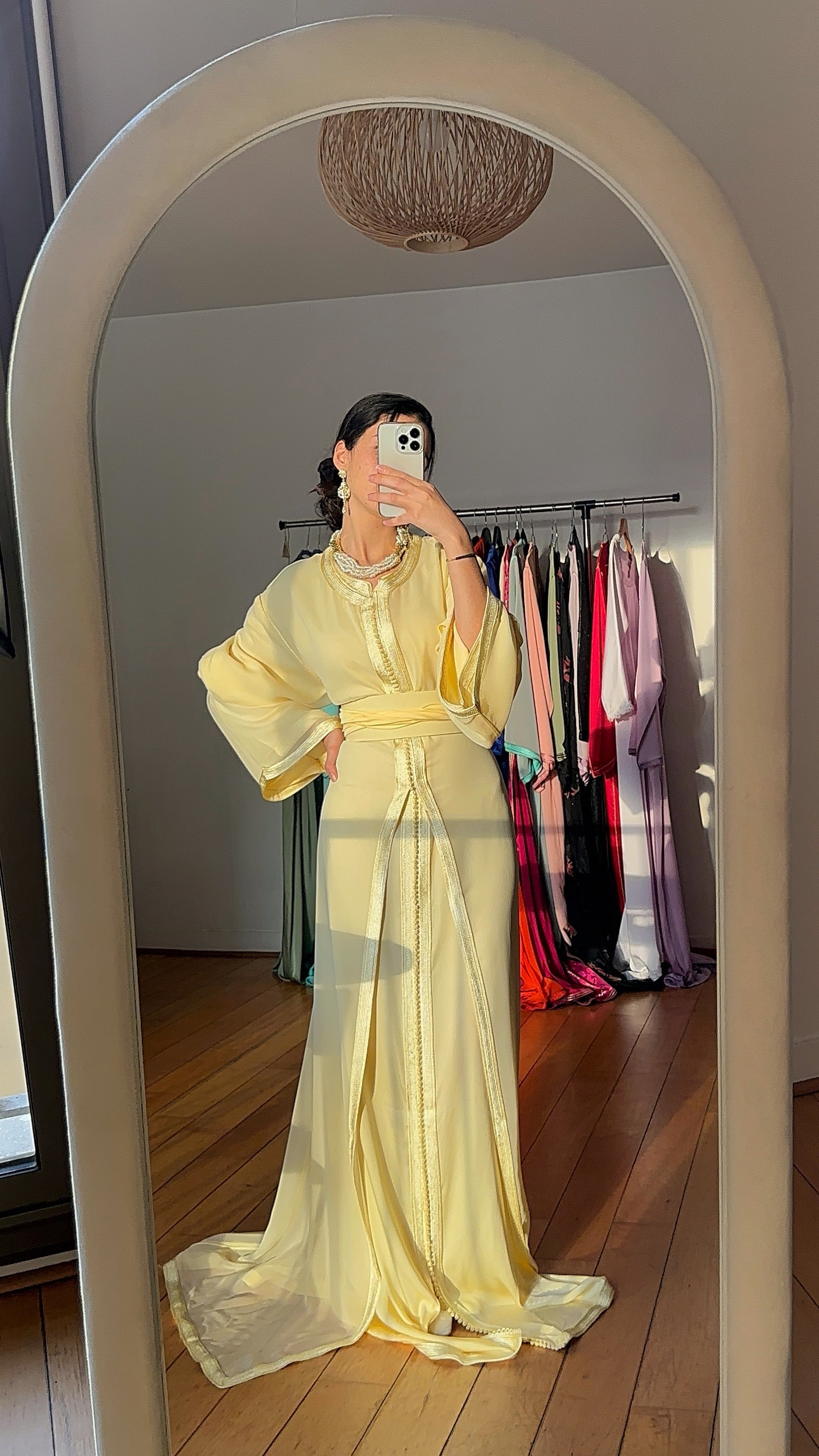 Découvrez notre magnifique caftan couleur jaune en soie et mousseline, une pièce d'exception qui allie éclat et légèreté. Sa teinte lumineuse et sa fluidité en font la tenue parfaite pour les mariages, les soirées de gala ou toute autre célébration où vous souhaitez vous démarquer.