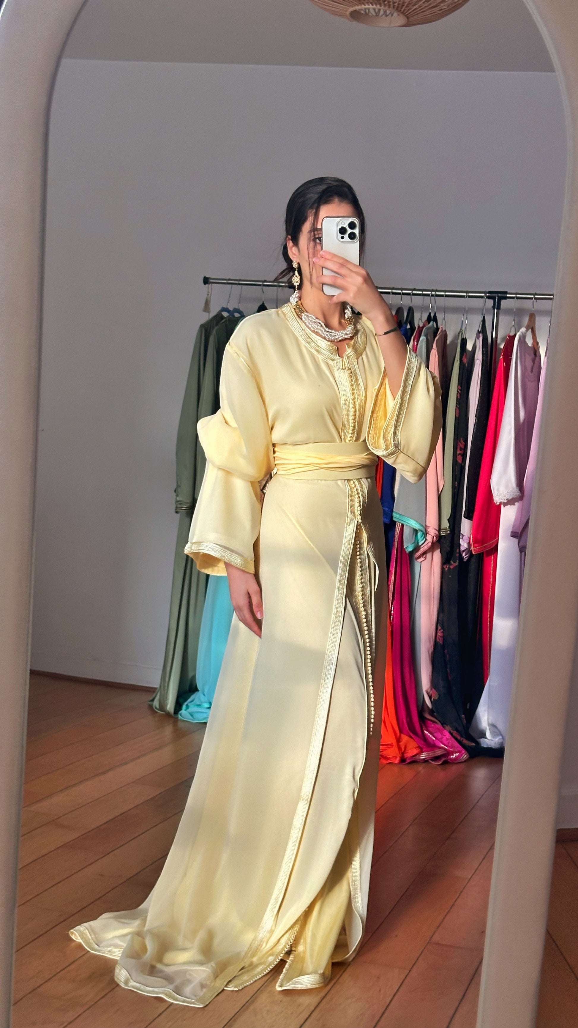 Ce caftan se compose d'un caftan en soie et d'une sur-robe en mousseline qui lui apporte un tombé fluide et un mouvement élégant.